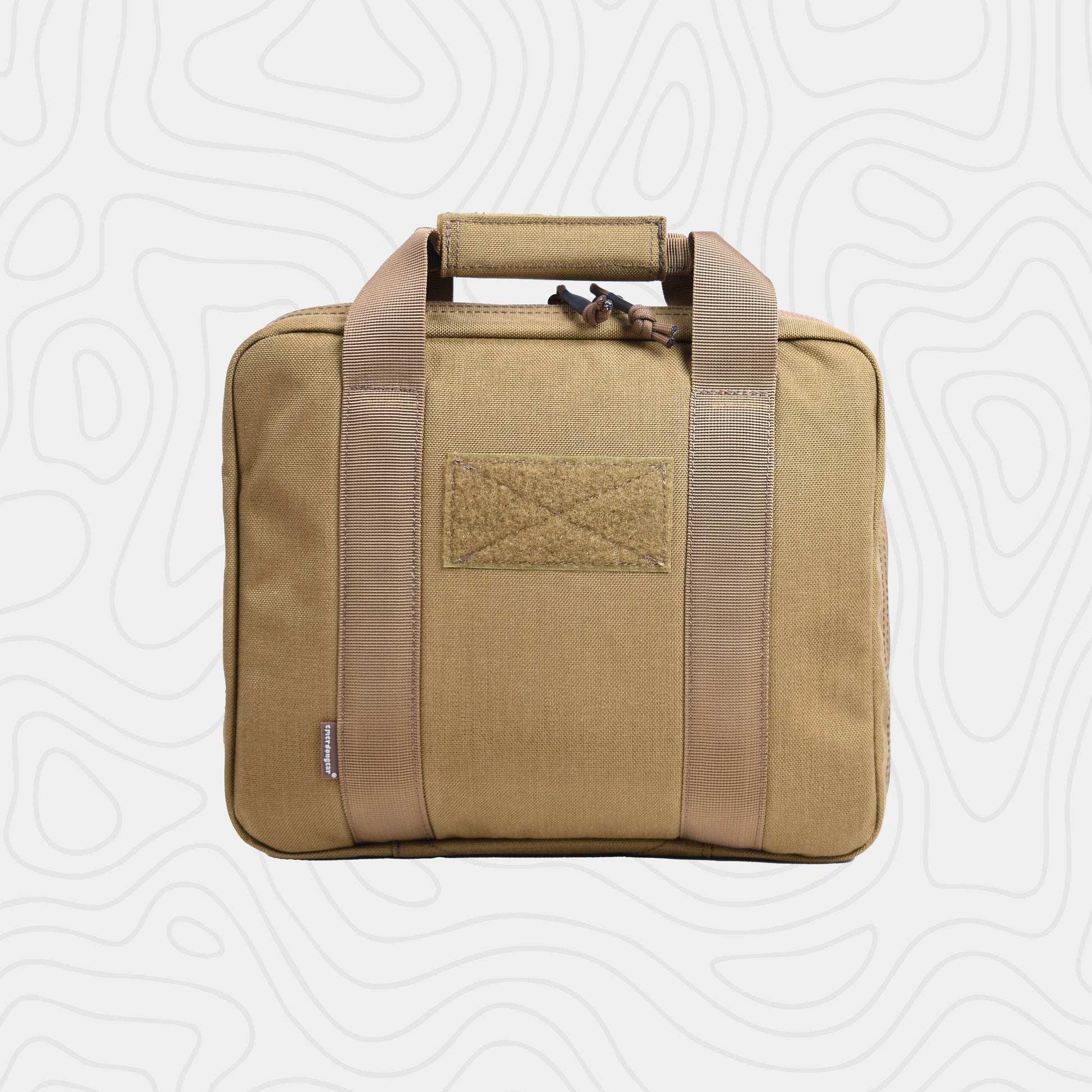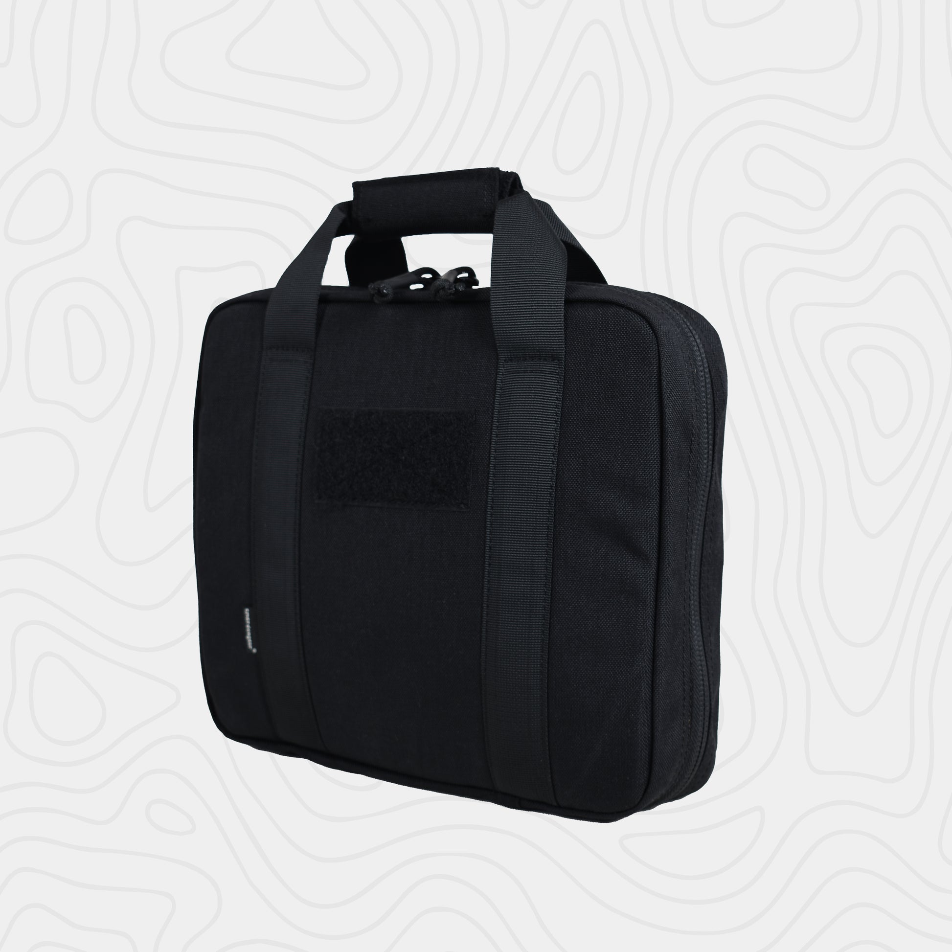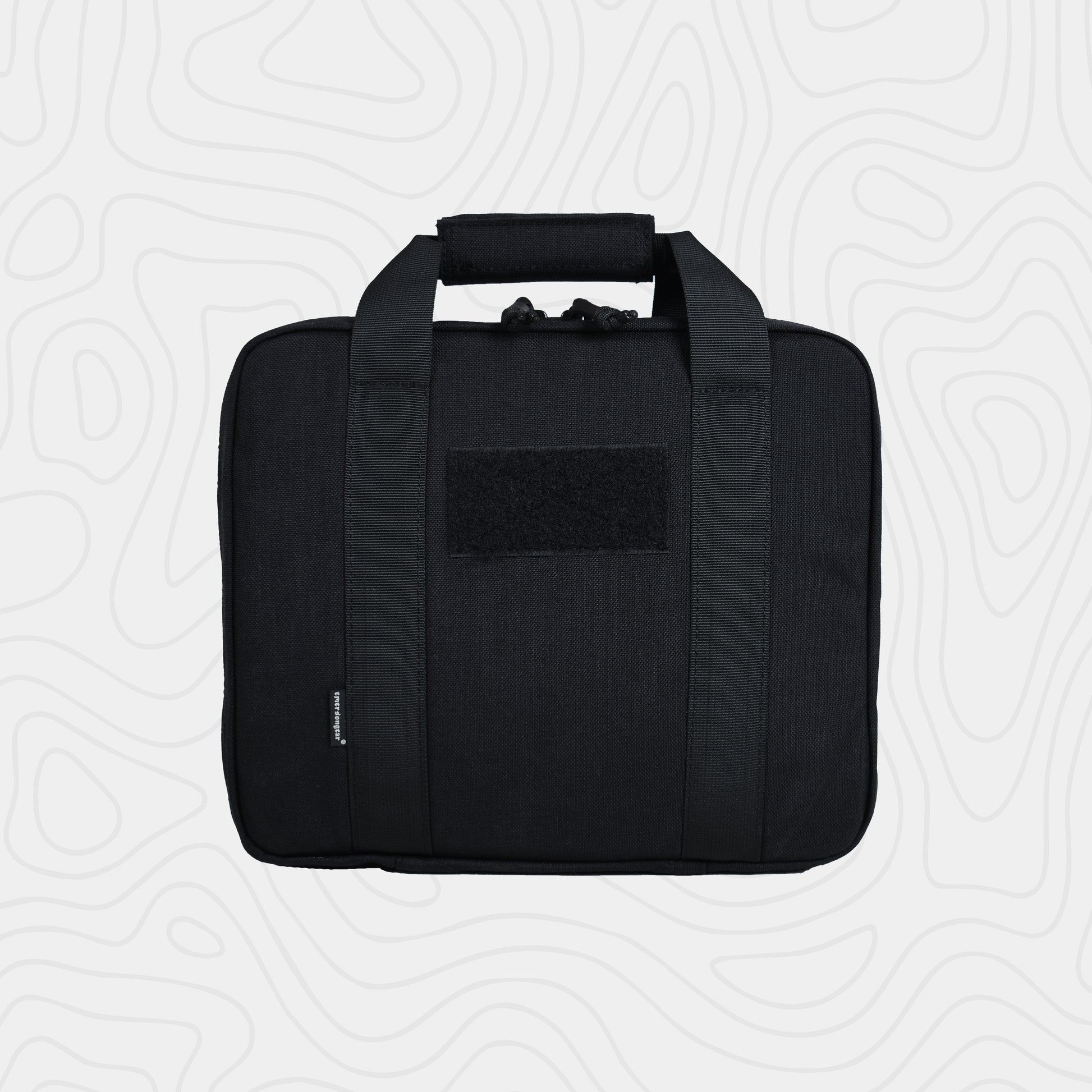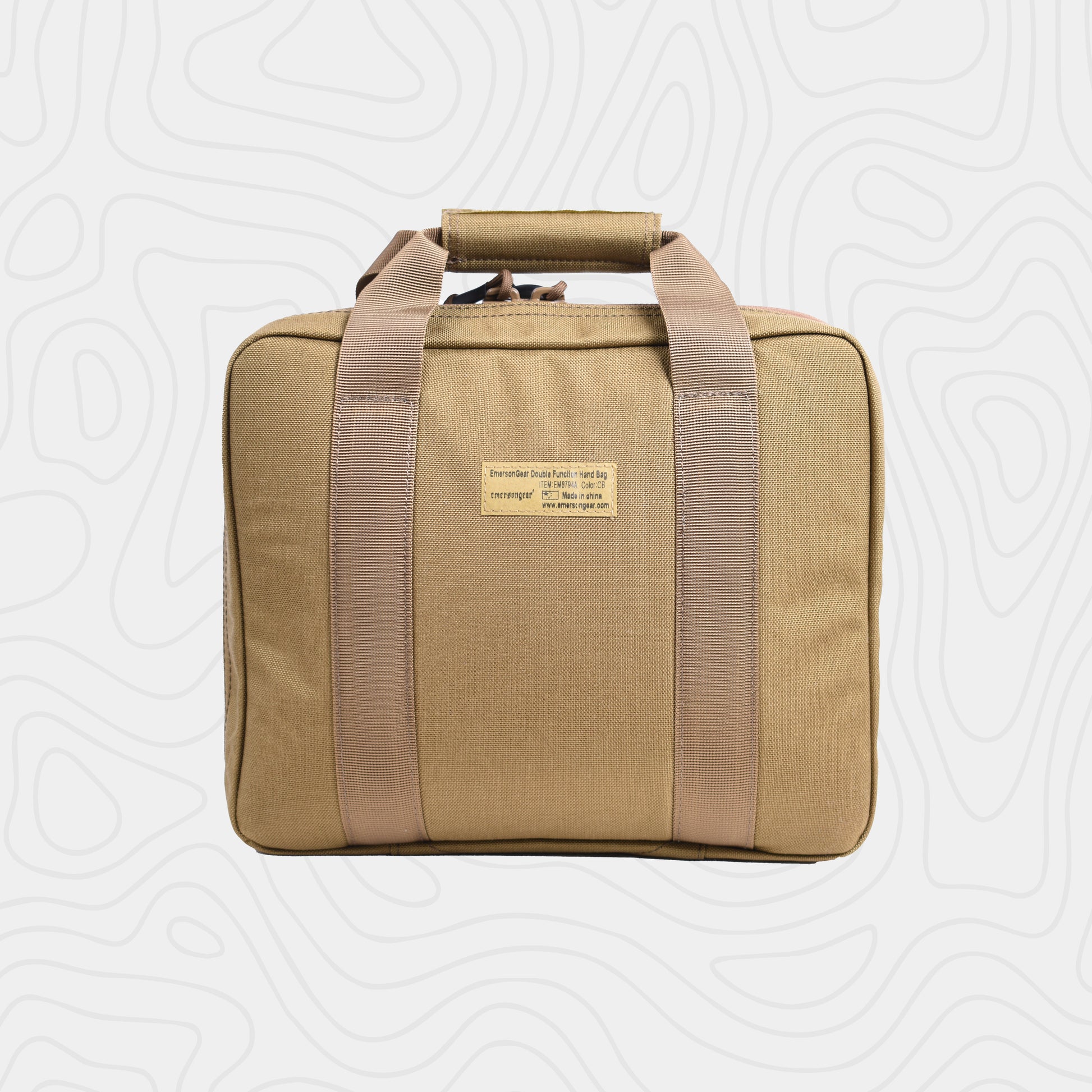 The EmersonGear Double Function Hand Bag is designed for carrying a pistol. The interior compartment features Velcro panels to secure items in place. The 500D nylon fabric offers excellent wear resistance. A water-repellent coating prevents moisture from penetrating. The bag features two handles connected by a soft padding for a comfortable grip.