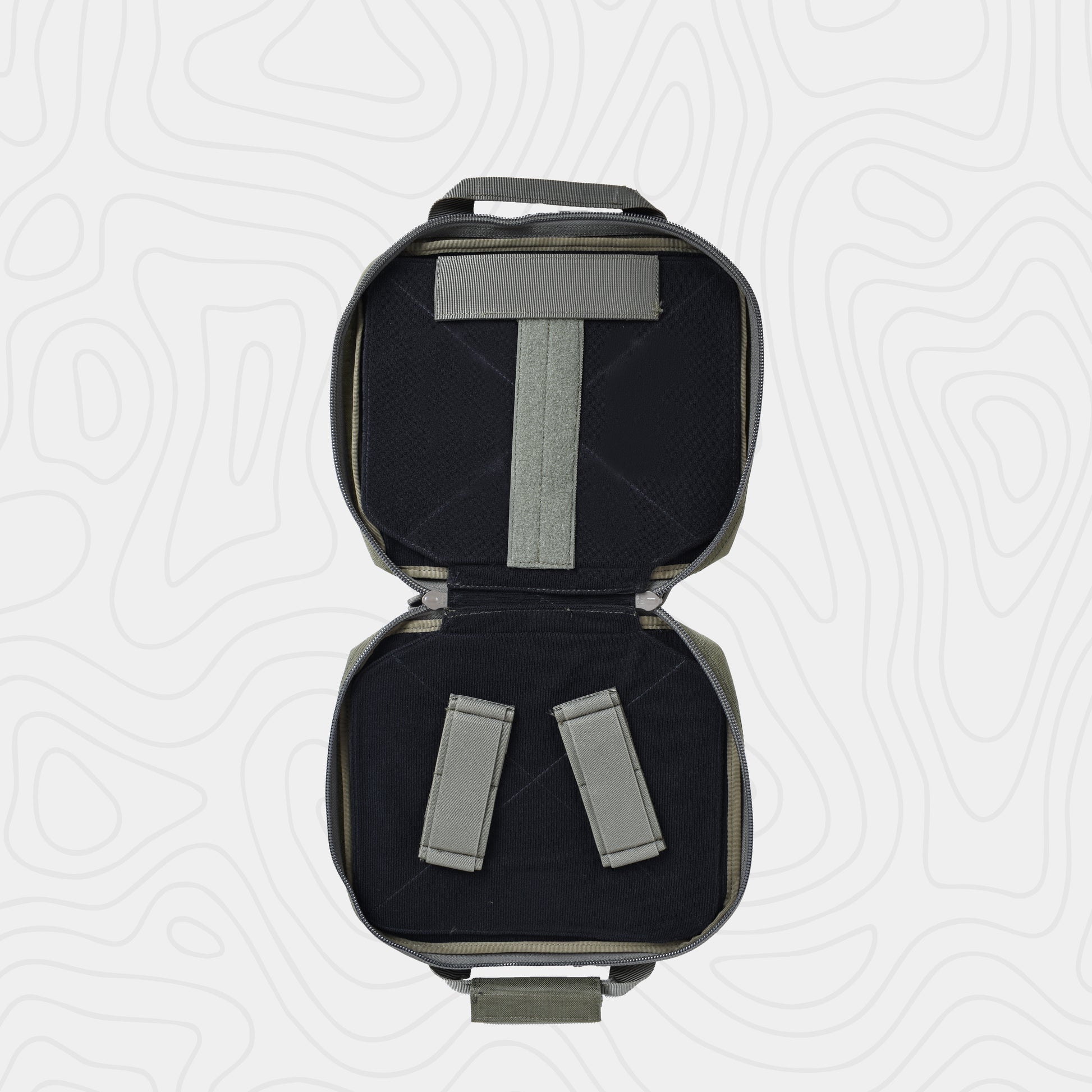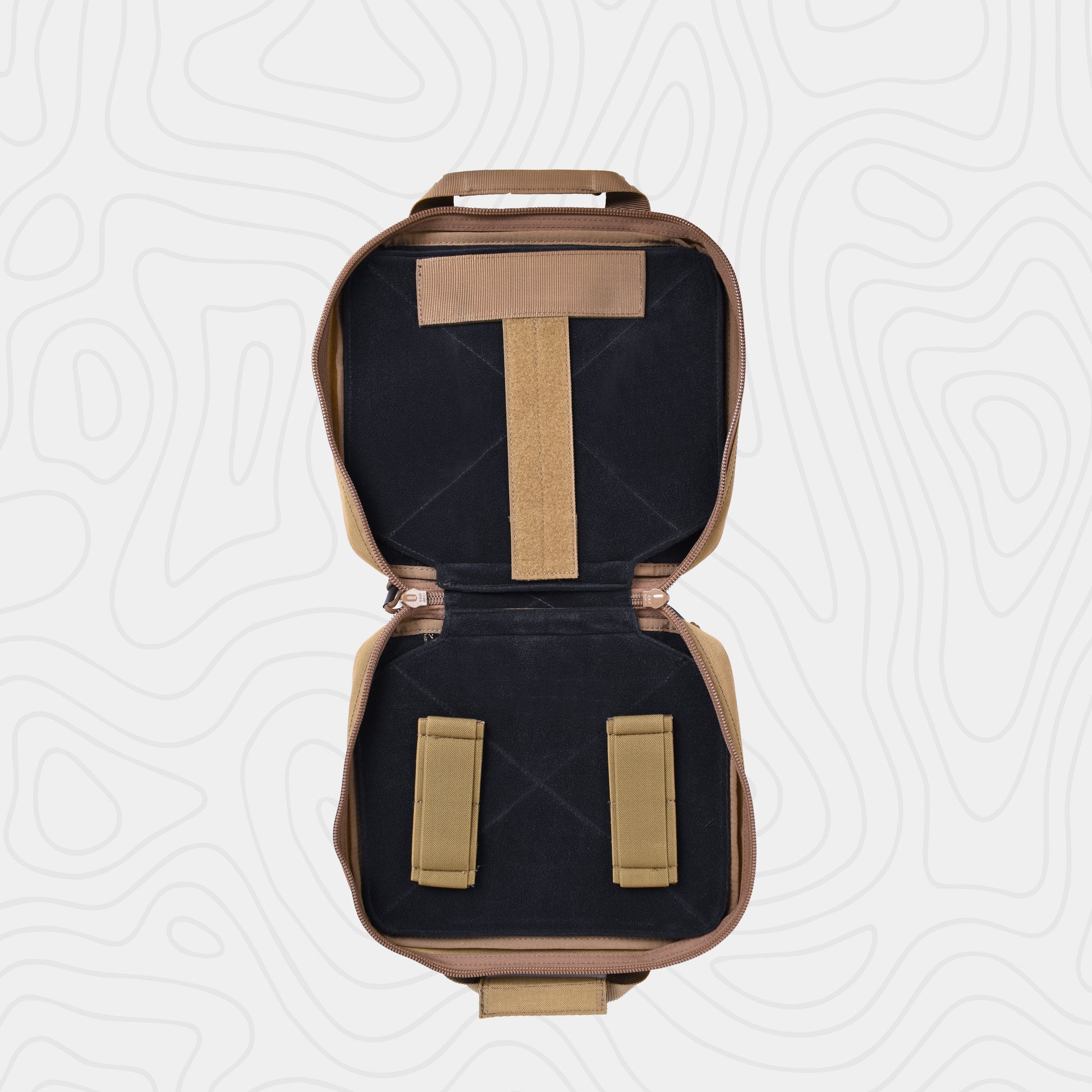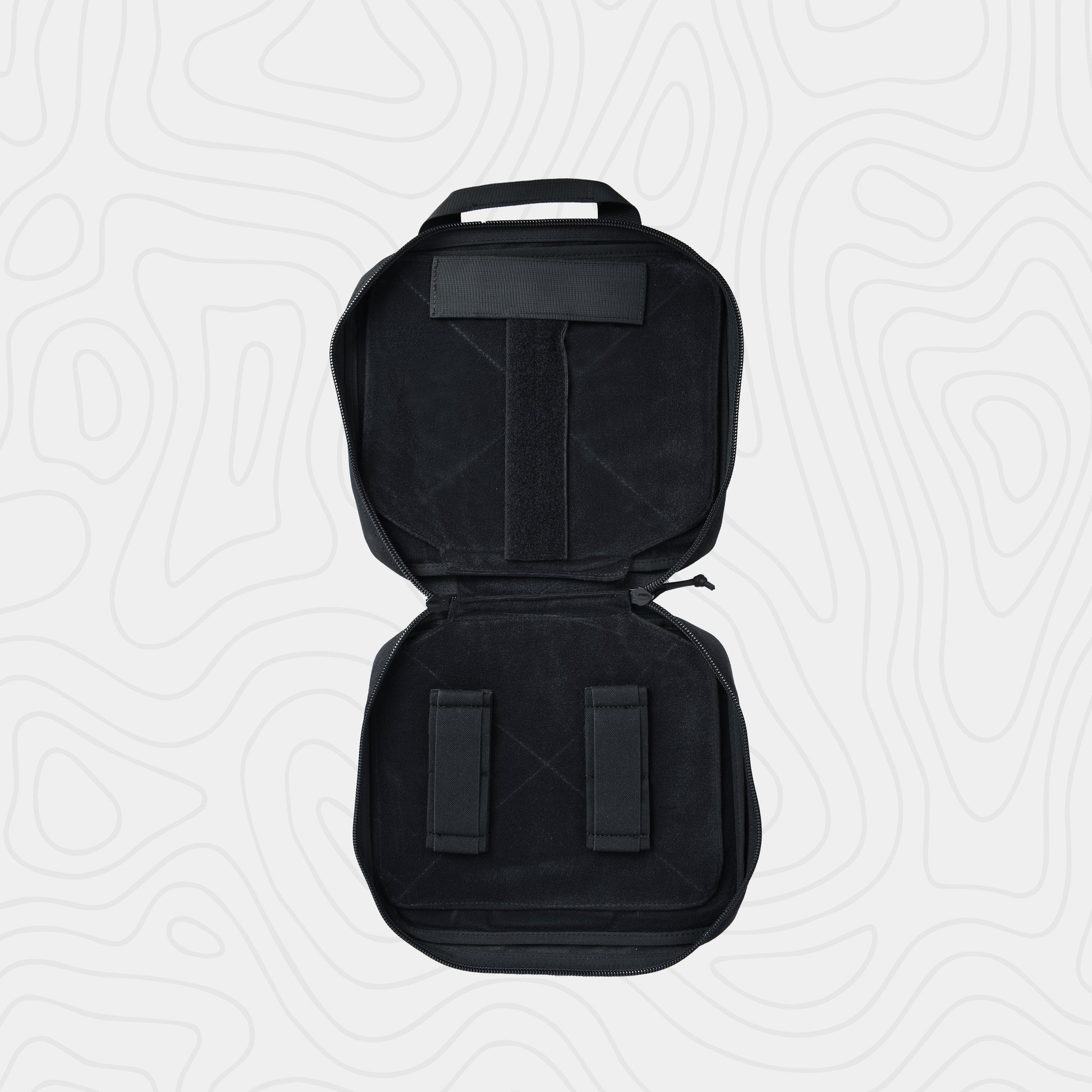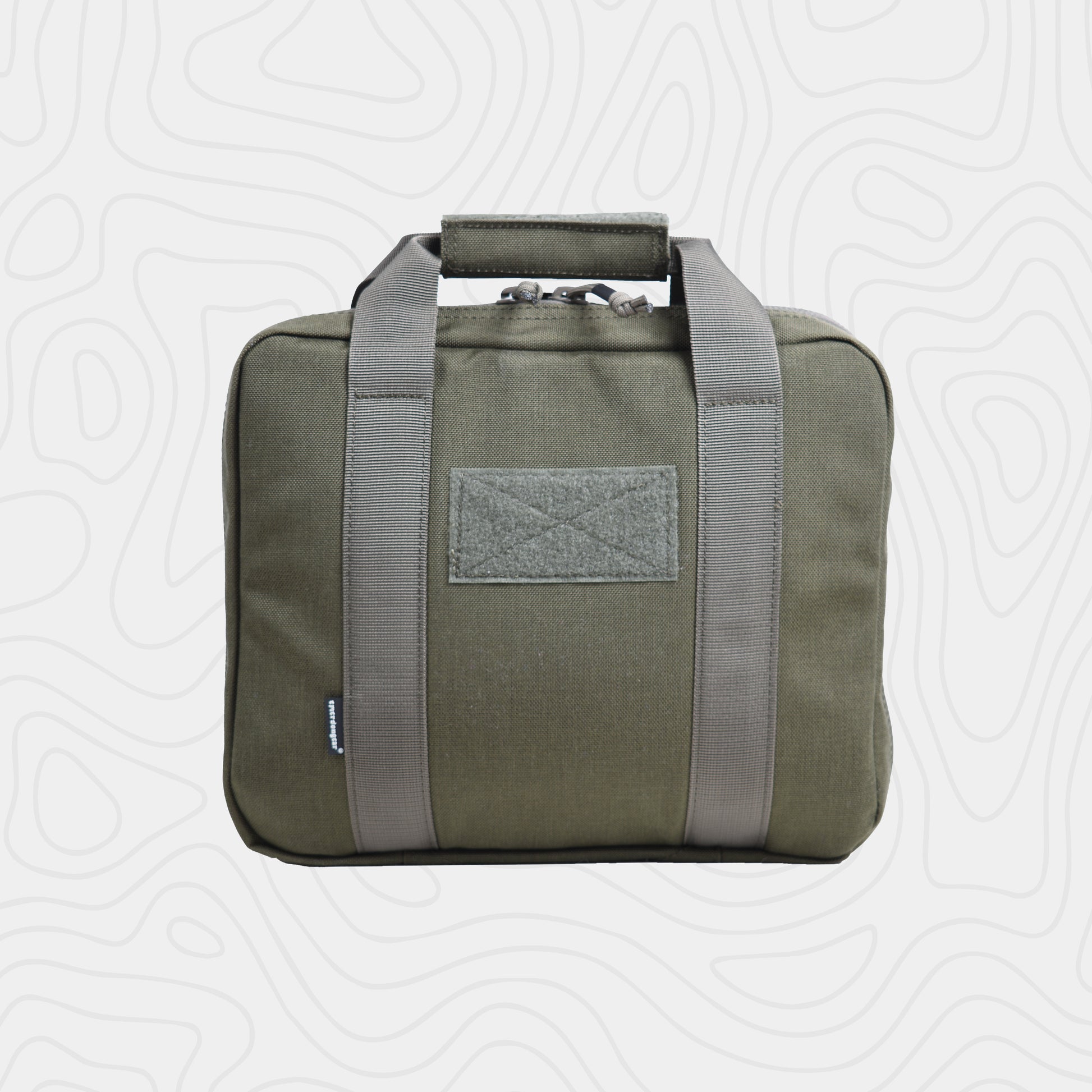 The EmersonGear Double Function Hand Bag is designed for carrying a pistol. The interior compartment features Velcro panels to secure items in place. The 500D nylon fabric offers excellent wear resistance. A water-repellent coating prevents moisture from penetrating. The bag features two handles connected by a soft padding for a comfortable grip.